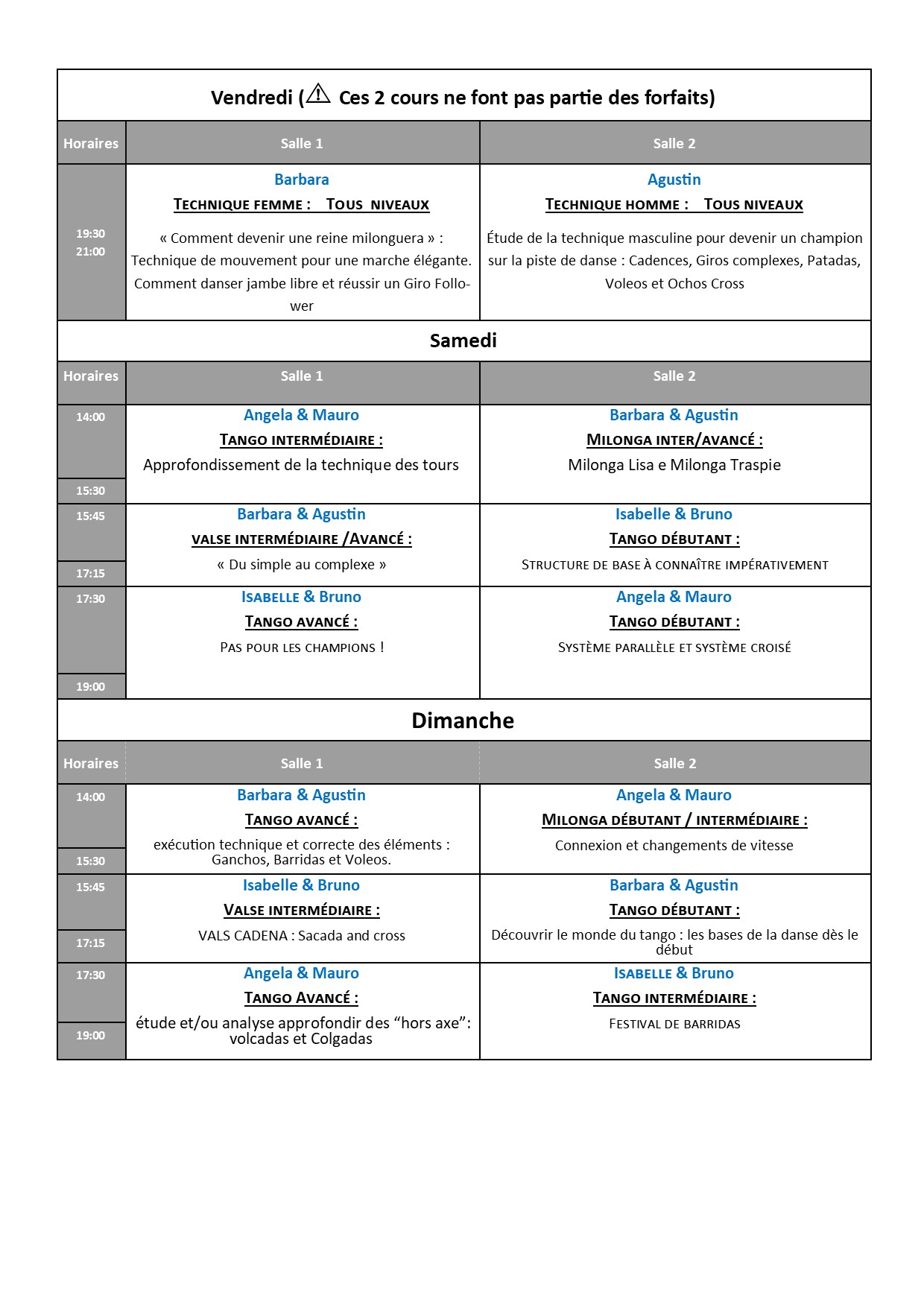 Vous pourrez bénéficier des stages du niveau débutant à avancé, dispensés par trois couples de danseurs de renommée venus partager leur expérience et leur savoir-faire :