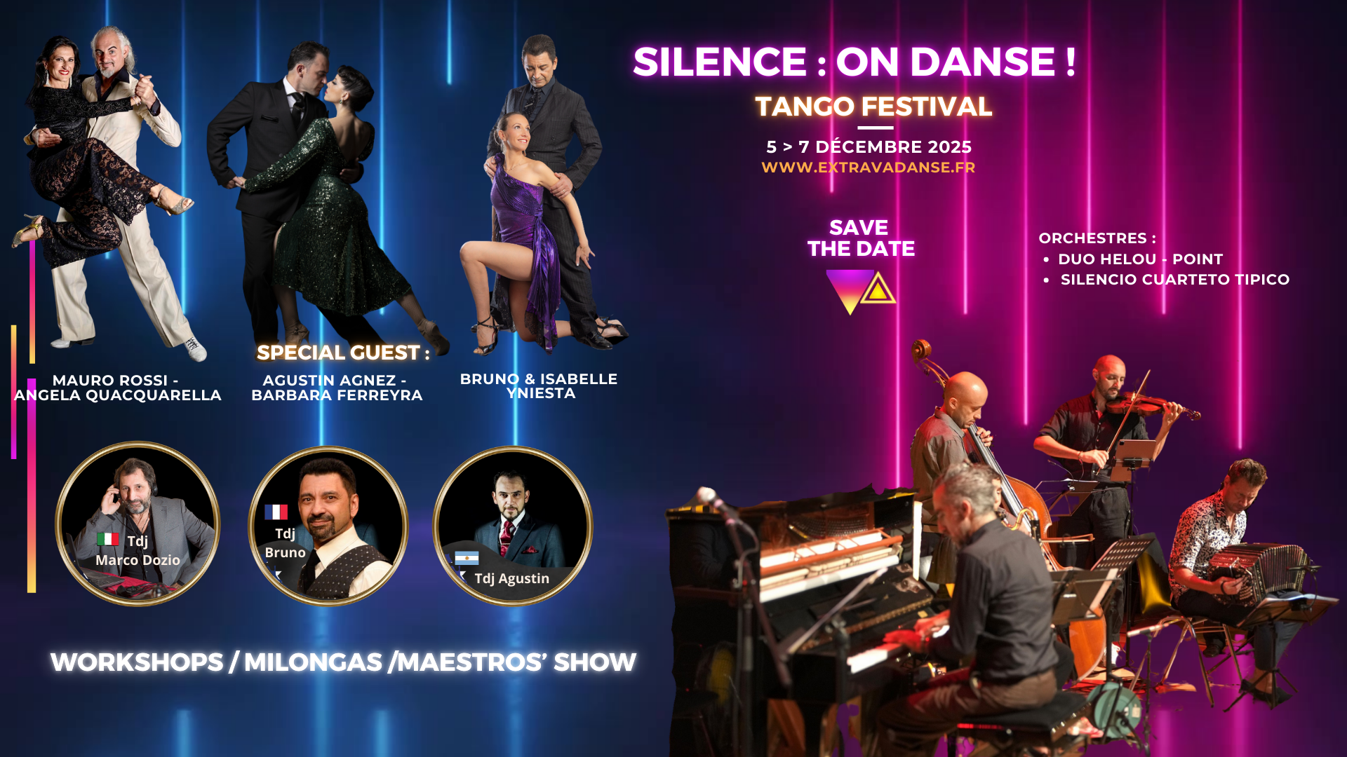 Pour votre plus grand plaisir, cette nouvelle édition du festival "Silence, on danse !" réunira, du 05 au 07 décembre 2025, des artistes talentueux, venus partager avec vous des jours et des nuits de cours, de démonstrations et de milongas inoubliables.