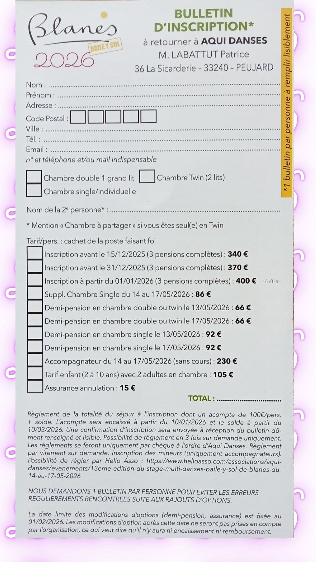1 bulletin d’inscription par personne
